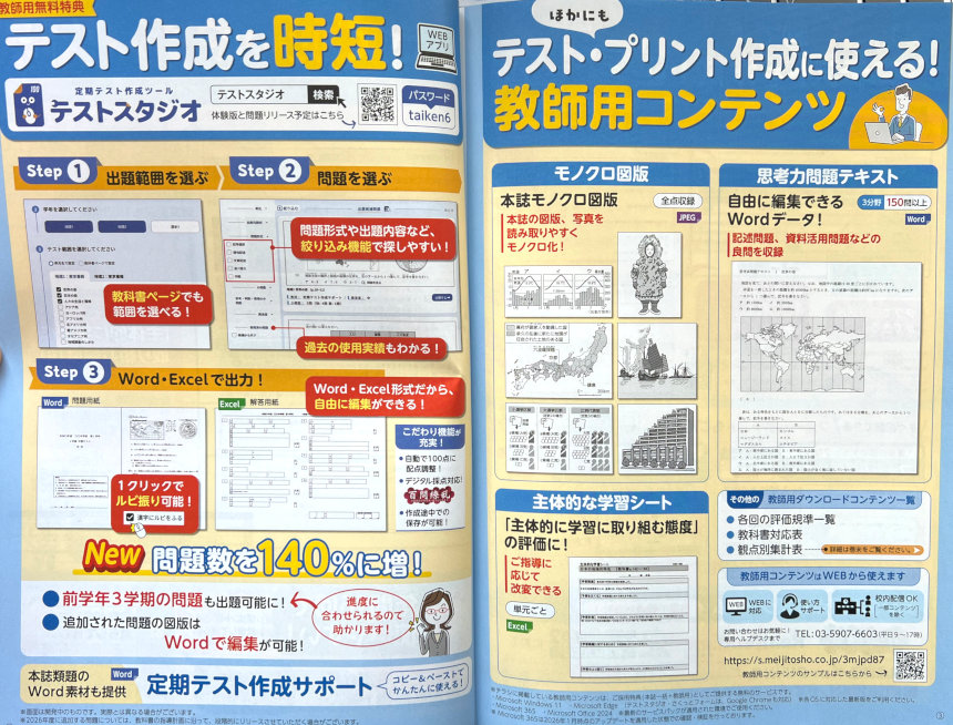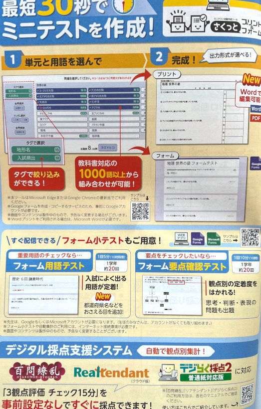 ・テストの範囲を選んで問題を選択するだけで、定期テストの素案が簡単に作成できます。モノクロ図版など差し替え用のコンテンツもございます。Word・Excel形式で出力、ルビ振りも対応しております。