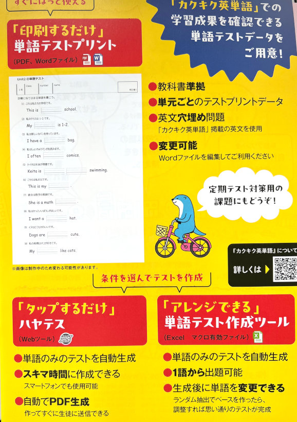 ■教師用コンテンツ内容・印刷するだけで使える単語テストプリント(PDF、Word形式)、タップするだけでテストを作れる『ハヤテス』など