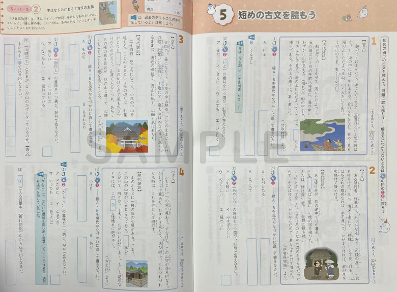 現代文では有名な作品の数々で問題を解くことができます。古典ではマンガ形式での導入で苦手な方でも楽しく学習できるようになっています。段階的に古文の練習に取り組むことができます。