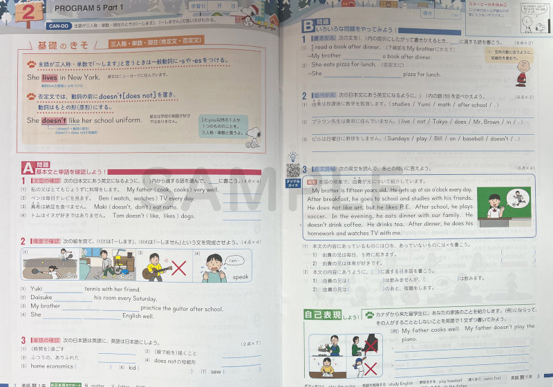 短い冬休みの期間でもやりきれる18ページの構成です。基礎・基本の復習、目的や場面を意識して英作文や読解問題に取り組める『ふゆ読』などの特集ページもございます。