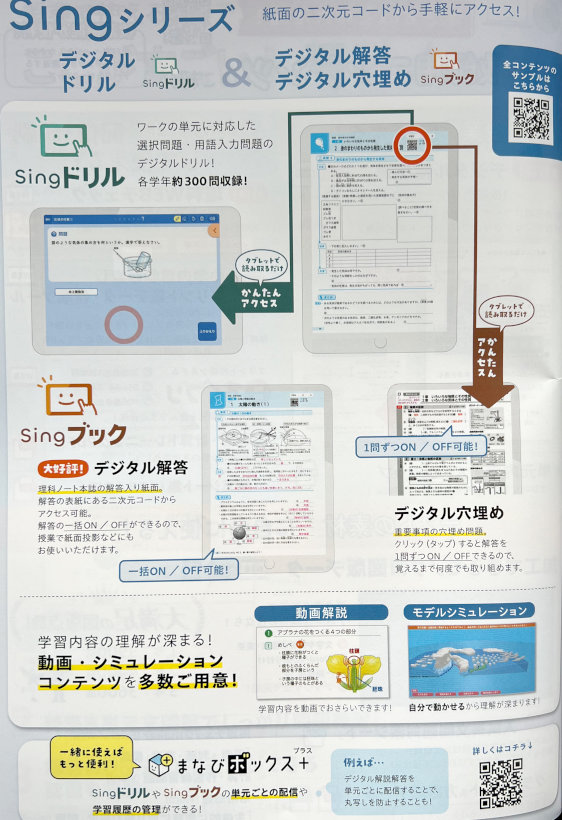 ワークの単元にピッタリなデジタルドリル、紙面投影などにも使える「デジタル解答」、学習内容の理解が深まる動画解説など