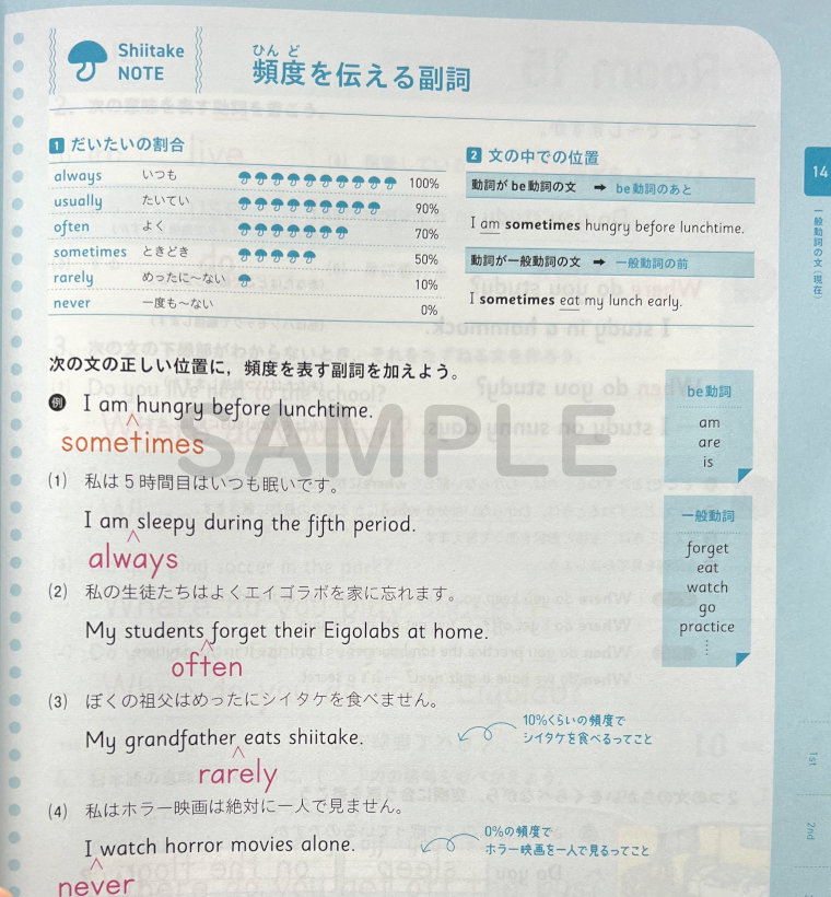 ■「頻度を表す副詞」「数えられる名詞・数えられない名詞」「場所の伝え方」などの事柄がまとまった特集ページ『Shiitake NOTE』