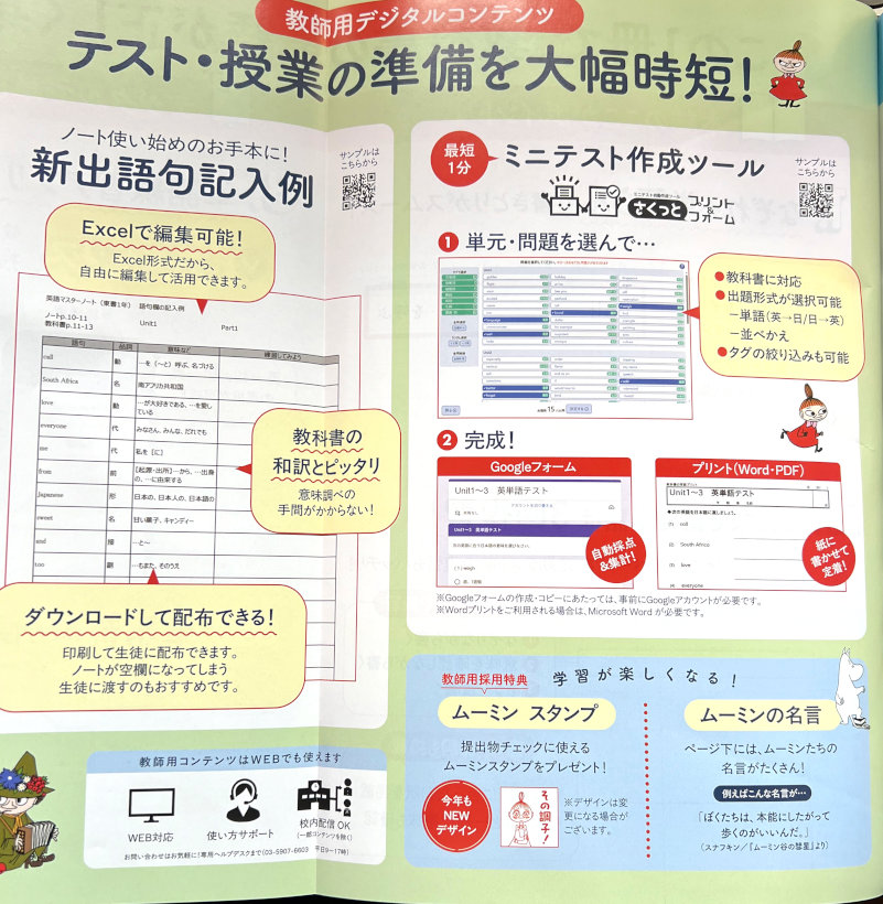 ■教師用コンテンツ内容教師用として、新出語句の記入例をダウンロードできます。プリント・Googleフォームテスト作成ツール、ムーミンスタンプもございます。