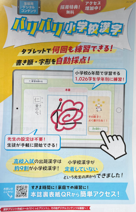 小学校で学習する漢字を学年別にタブレット端末で何回も練習できます。