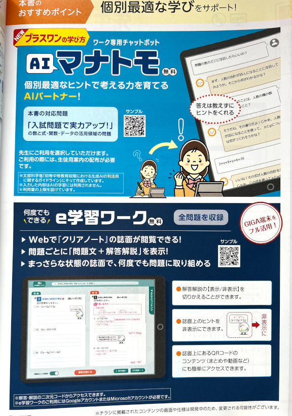 ■生徒用デジタルコンテンツ内容・AIが生徒の質問に回答したり、段階的なヒントを出したりすることで、答えにたどり着くようにサポートする、ワーク専用チャットボット 「AIマナトモ」