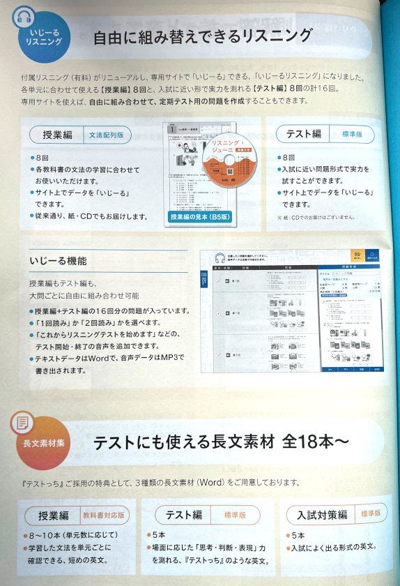 ・各単元に合わせて使える授業編8回(紙・CDでのご提供)、入試に近い形で実力を測れるテスト編8回(Webでのご提供)。専用サイトで大問ごとに自由に組み合わせることが可能です。1回読み・2回読みの音声を選べます。テキストデータはWord、音声データはMP3で書きだされます。